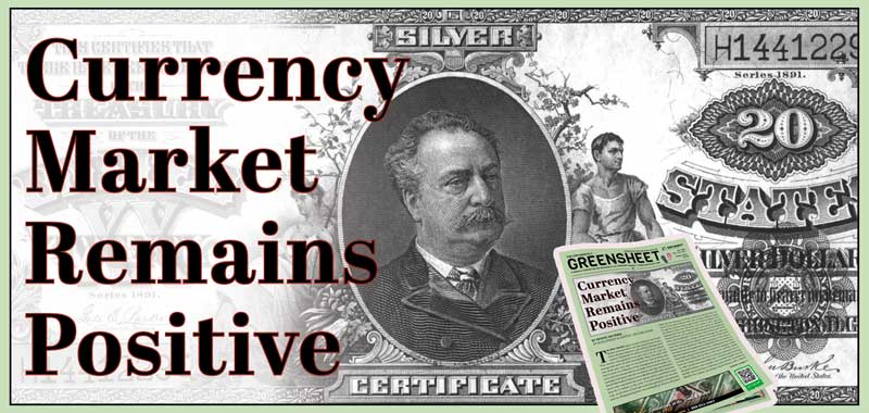 The Greensheet bid prices are derived from two primary sources: public trades of United States currency, primarily via auction results, and anecdotal dealer information. Whereas United States coins have a tradition of dealer bids posted on electronic trading networks and buy sheets, the currency market relies more on auction results and specialists. We are in regular contact with the major currency buyers in the market.